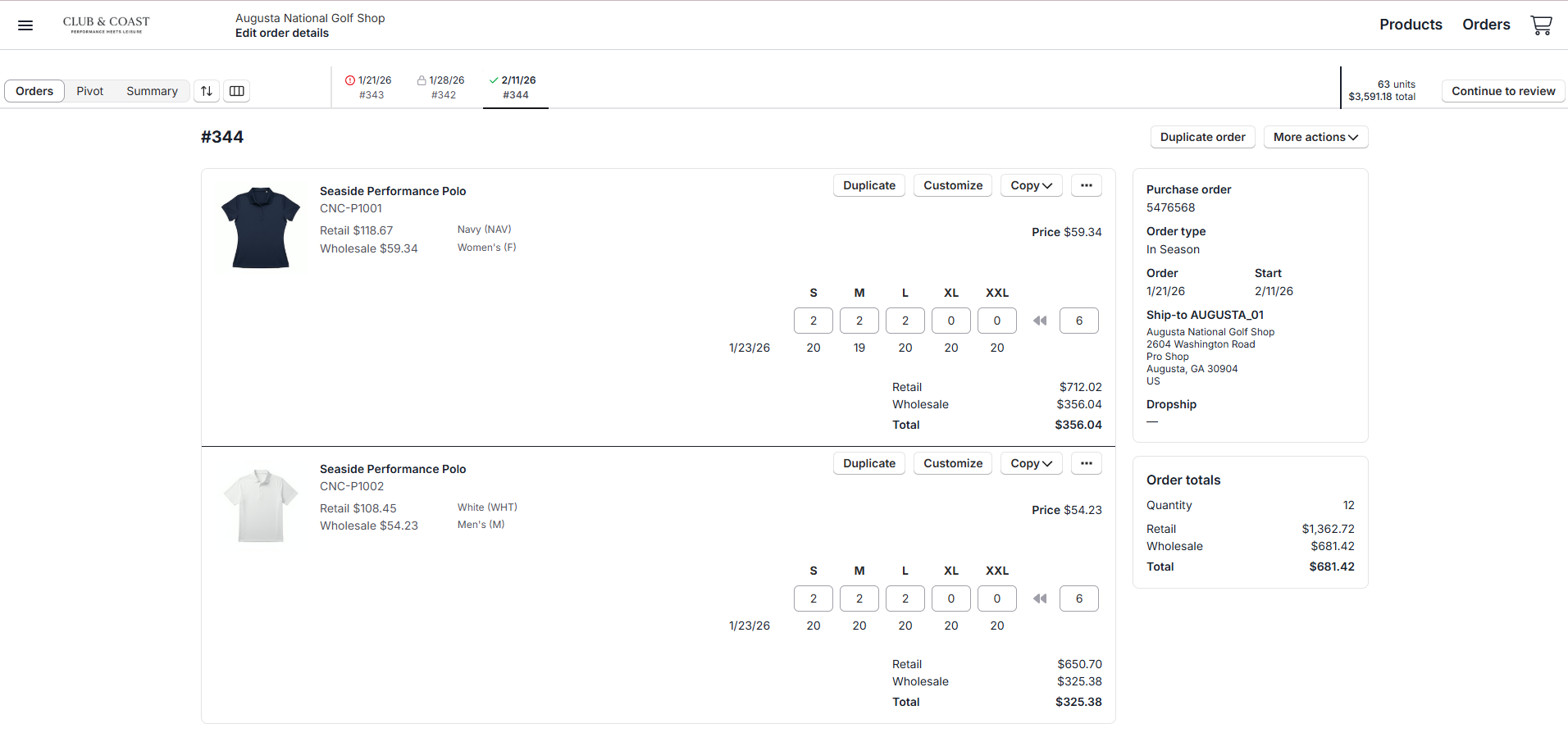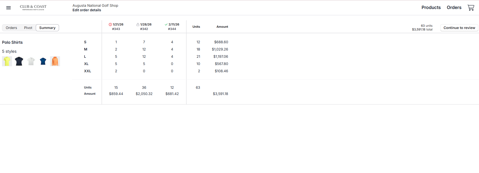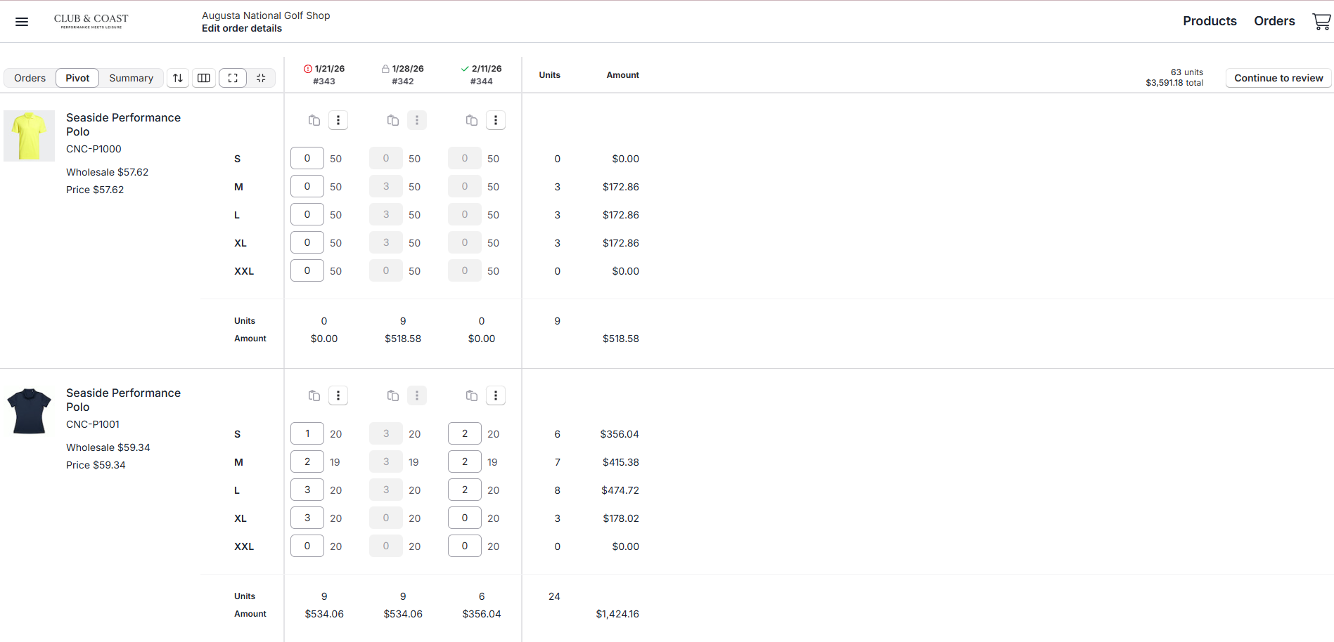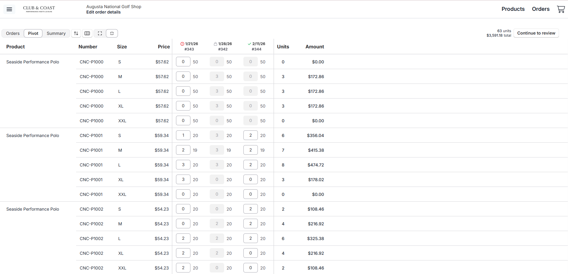 Note: Switch to standard Pivot or Orders view if you need to add/remove products or copy size runs