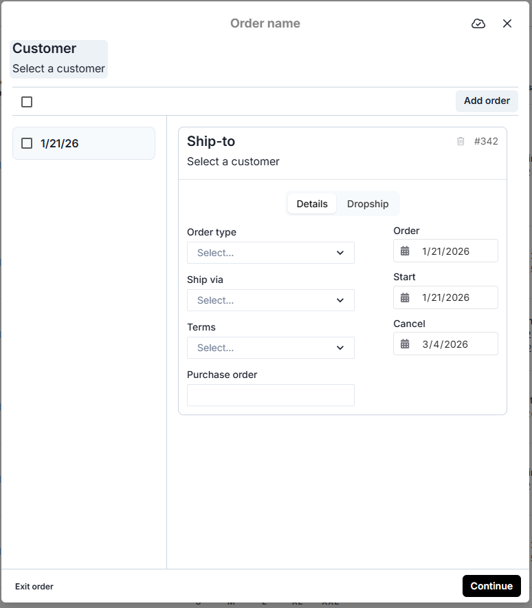 Click Start order at the top to configure your order header first