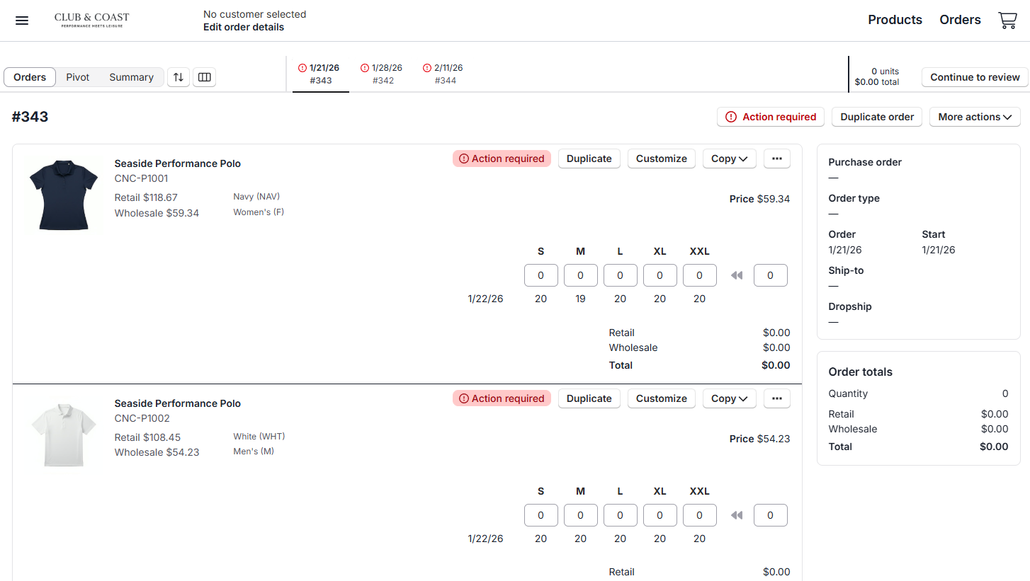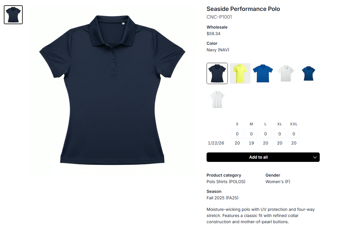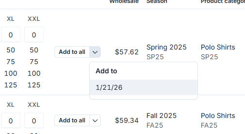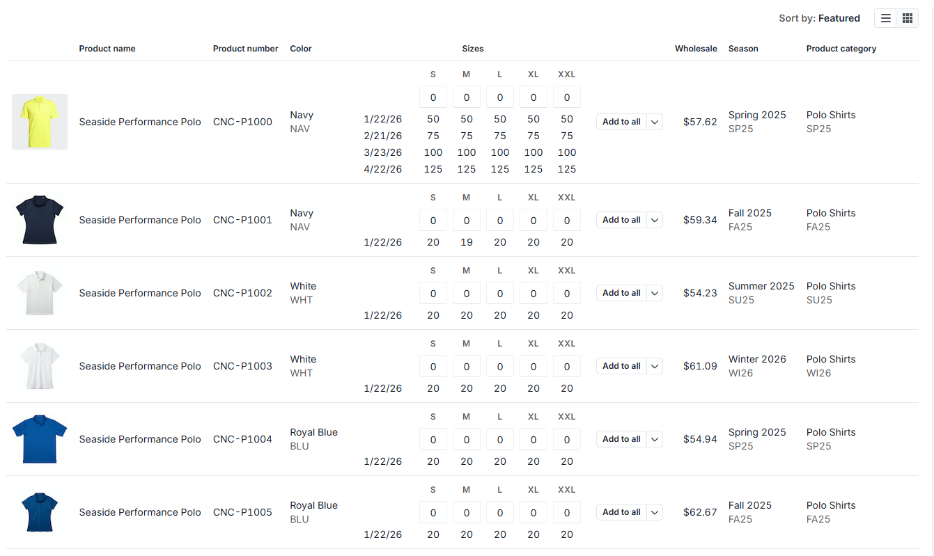 Direct quantity entry: Type quantities directly in the size fields on the product listing