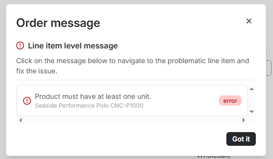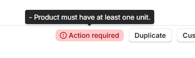 If there are validation errors, you'll see an Action required indicator. Click it to view specific messages and navigate directly to items needing adjustment. You can also hover over the line item level error to see the specific errors and resolve them.